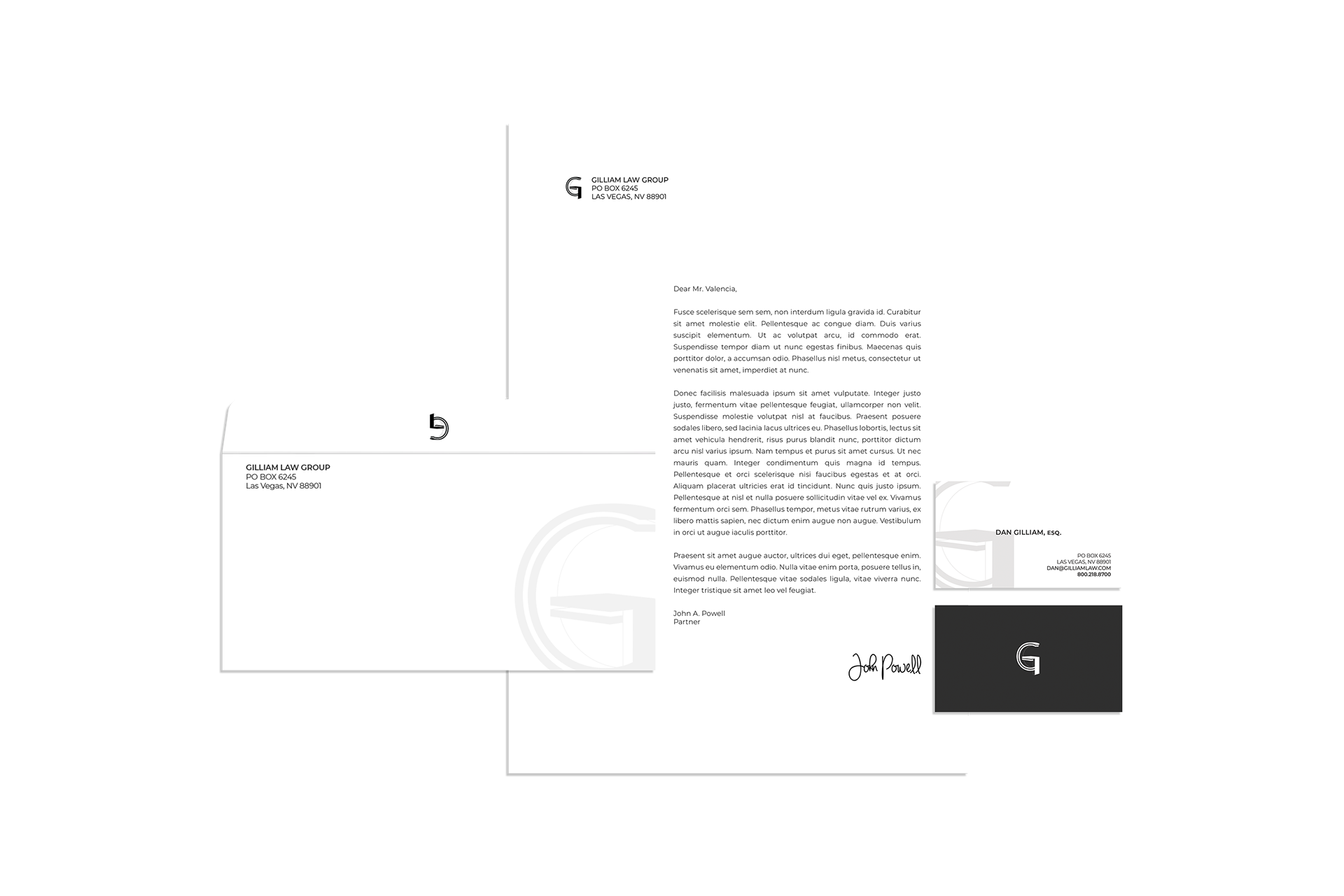 After practicing law in the Las Vegas area for over a decade, Dan Gilliam opened his own firm in 2014. The client wanted an identity package that was bold, classy, and timeless. The classic art deco-style logomark creates a classic look, while the three-dimensional design adds a modern touch. The rest of the package utilizes a single typeface with varying weights to deliver a clean, classic look.