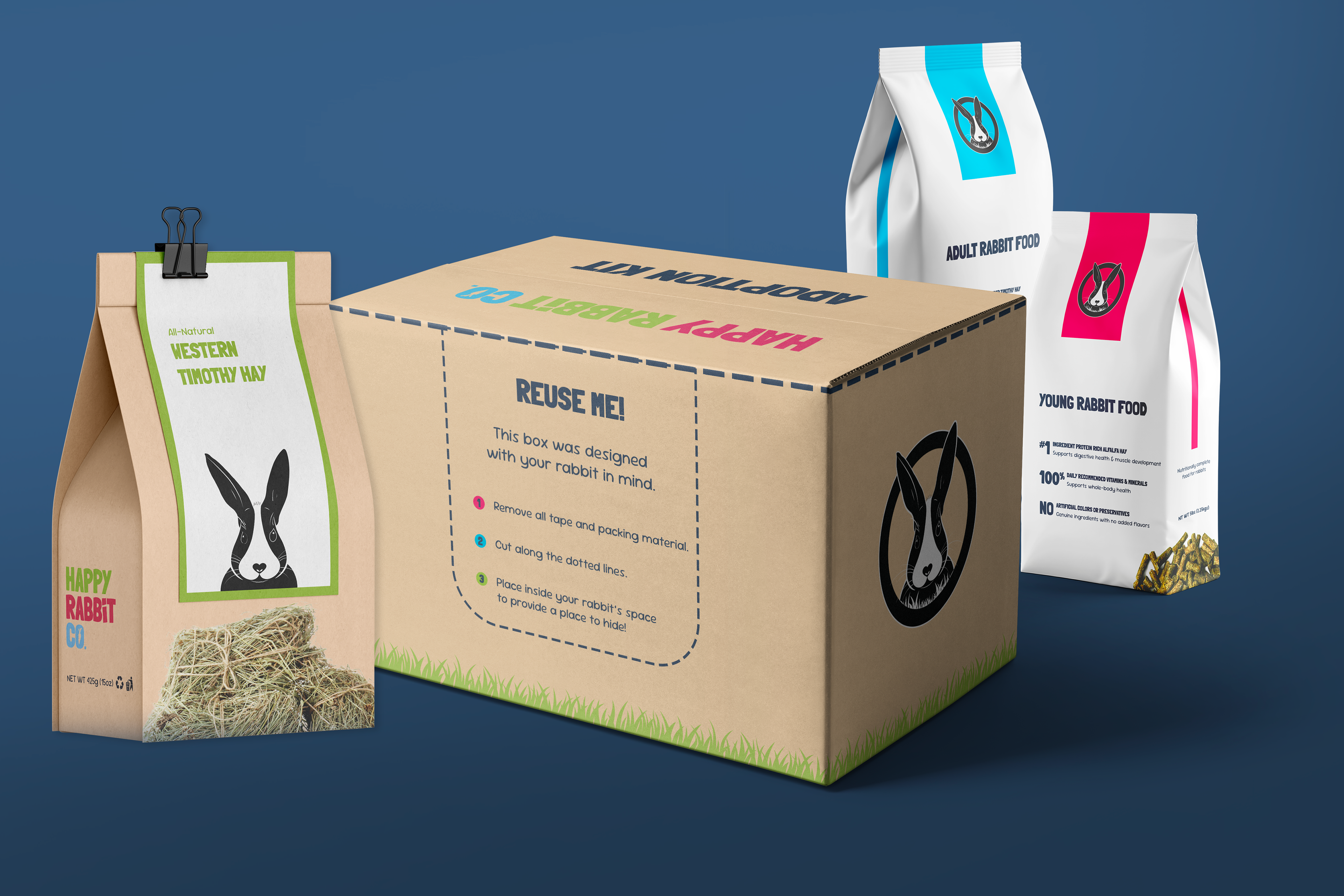 Adoption kit overview featuring hay, pellets, and a reusable box.